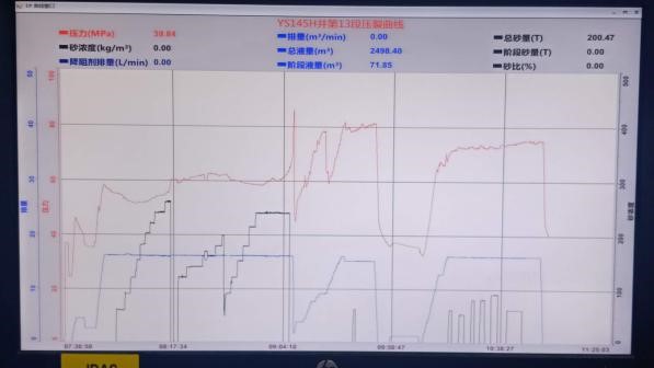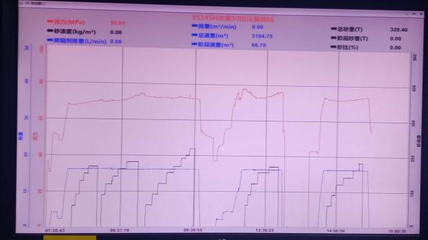 圖4 現(xiàn)場壓裂曲線圖(部分) ![]() 圖5 現(xiàn)場壓裂工作圖(部分) 經(jīng)過15天的艱苦奮戰(zhàn),累計(jì)進(jìn)行了14段速鉆橋塞壓裂作業(yè),其中壓裂最高壓力達(dá)86.4MPa,最大砂量320.4噸,最高總液量3194.75立方。宏達(dá)機(jī)械以過硬的服務(wù)質(zhì)量,較為圓滿的協(xié)助用戶完成了現(xiàn)場壓裂工作。